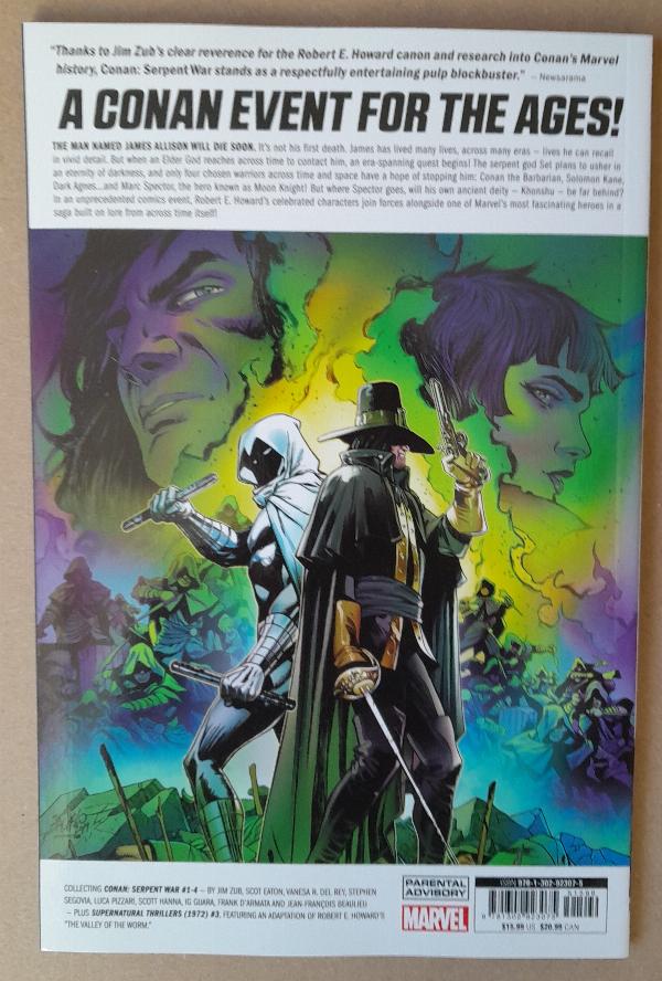 A Conan event for the ages! The man named James Allison will die soon. It's not his first death. James has lived many lives, across many eras - lives he can recall in vivid detail. But when a mysterious force reaches across time to engage his abilities to save all of reality, an era-spanning quest begins! The serpent god Set plans to usher in an eternity of darkness, and only four chosen warriors across time and space have a hope of stopping him: Conan the Barbarian, Solomon Kane, Dark Agnes...and the man known as Moon Knight! But where Marc Spector goes, will his own ancient deity - Khonshu - be far behind? In an unprecedented comics event, Robert E. Howard's celebrated characters join forces alongside one of Marvel's most fascinating heroes in a saga built on lore from across time itself! Collecting Conan: Serpent War (2019) 1-4, Supernatural Thrillers (1972) 3.