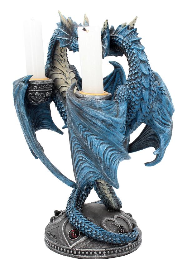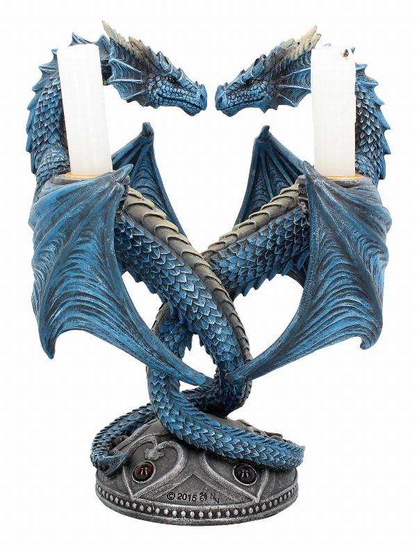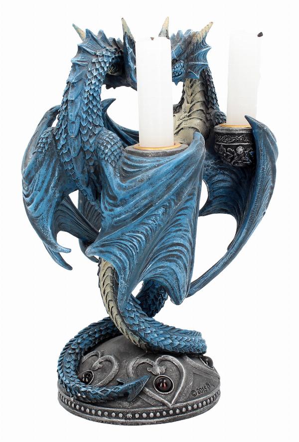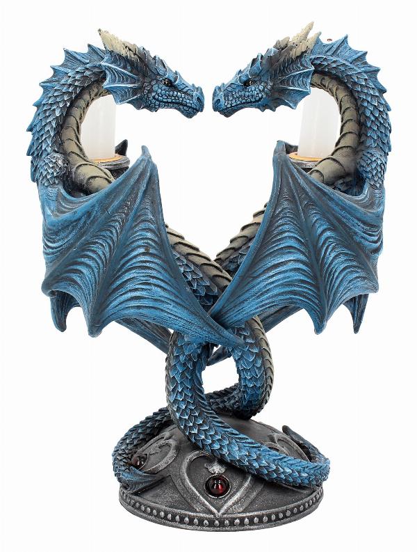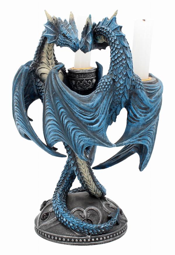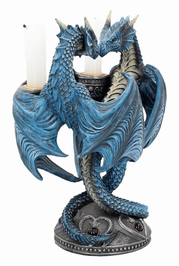 Very nice quality Anne Stokes candle holder featuring two blue dragons entwined together creating a heart shape. Candle holder on each dragon.
