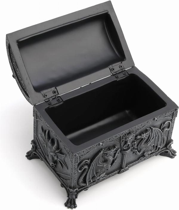 Celtic themed stone effect trinket box with a guarding dragon poised on the lid. 4 clawed feet feature.