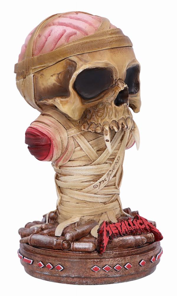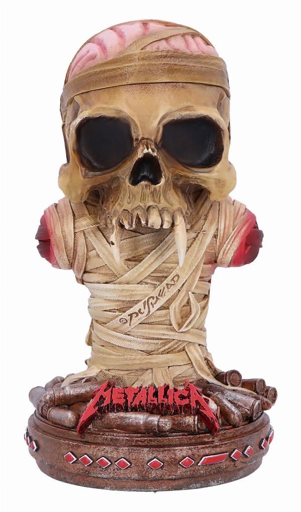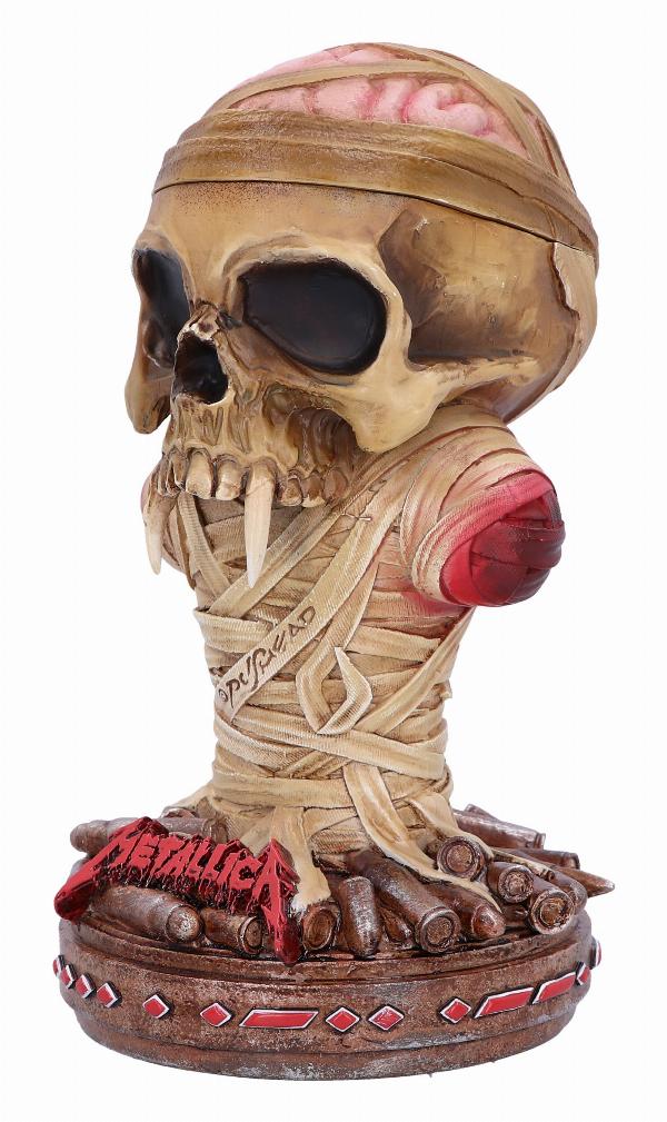 Show your allegiance to the Gods of Metal with this officially licensed Metallica One Box. Inspired by the single 'One' taken from the band's fourth studio album 'And Justice for All'. Which portrays a severely wounded soldier who can be seen wrapped in bandages after being blown up by a landmine. Stood upon a pile of bullet shells, where the Metallica sits proudly, and is instantly recognisable to any heavy metal fanatic. Cast in the finest resin before being expertly hand-painted, this piece is a perfect way to pay homage to one of the most influential heavy metal bands of all time!