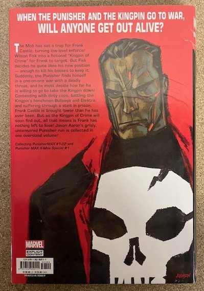 Jason Aaron and Steve Dillon's grisly, uncensored Punisher run is collected in one oversized volume! The mob has set a trap for Frank Castle, turning low-level enforcer Wilson Fisk into a fictional "Kingpin of Crime" for Frank to target. But Fisk decides he quite likes his new position - enough to kill his bosses to keep it. Suddenly, the Punisher finds himself in a one-on-one war with a deadly threat, and he must decide how far he is willing to go to take down the Kingpin! Contending with dirty cops, battling the Kingpin's henchmen Bullseye and Elektra, and suffering through a stint in prison, Frank Castle is brought lower than he has ever been. But as the Kingpin of Crime will soon find out, all that means is Frank has nothing left to lose! Collecting PUNISHERMAX (2009) #1-22 and PUNISHER MAX X-MAS SPECIAL #1.