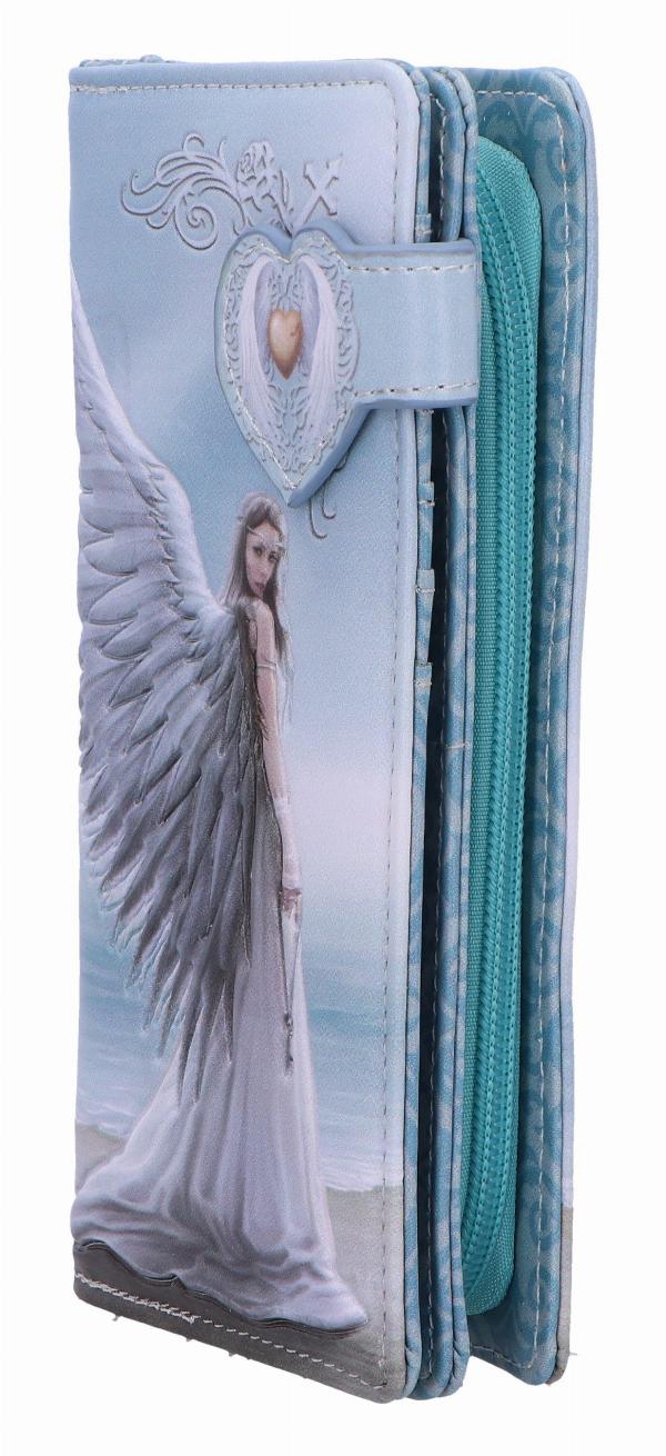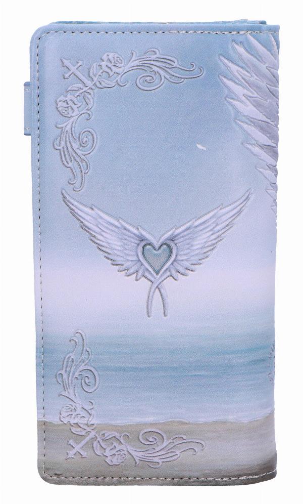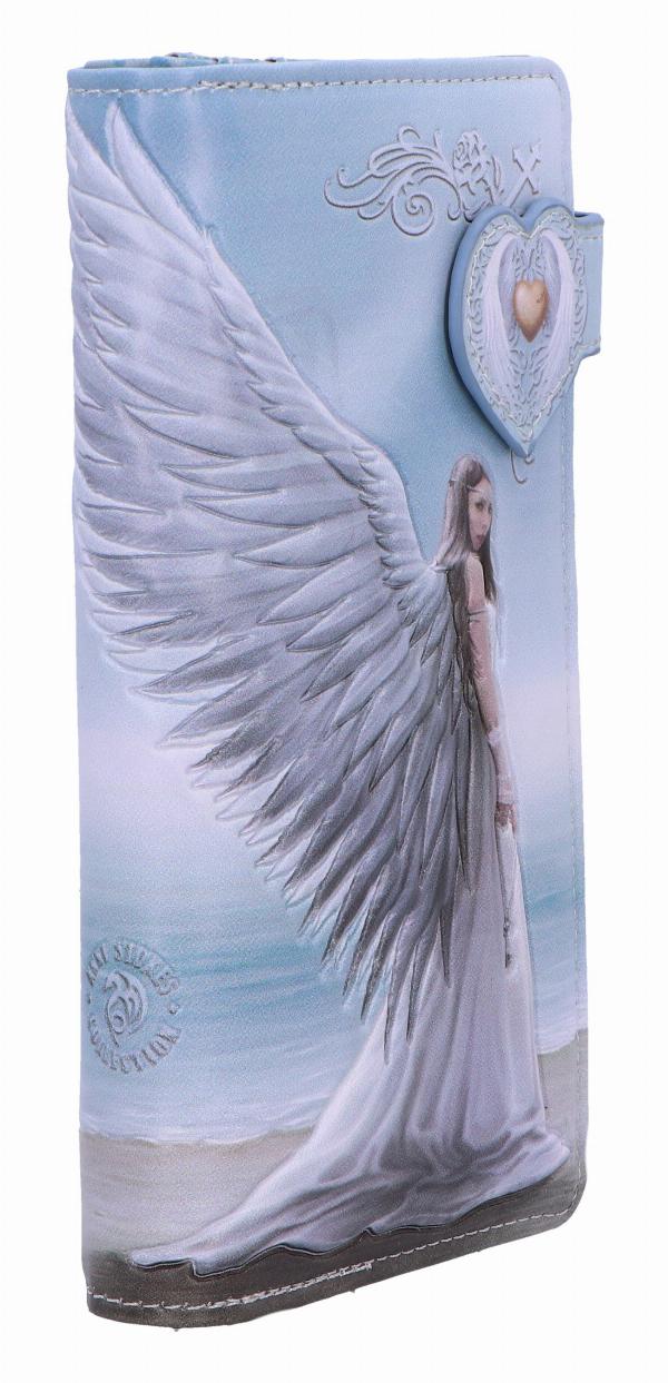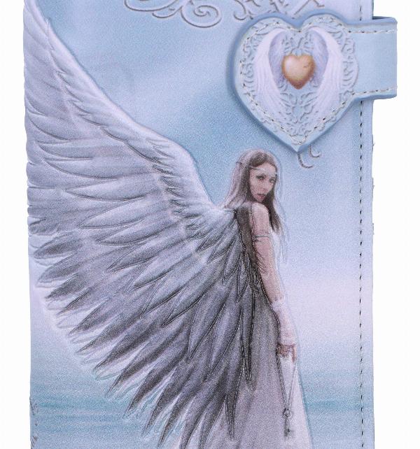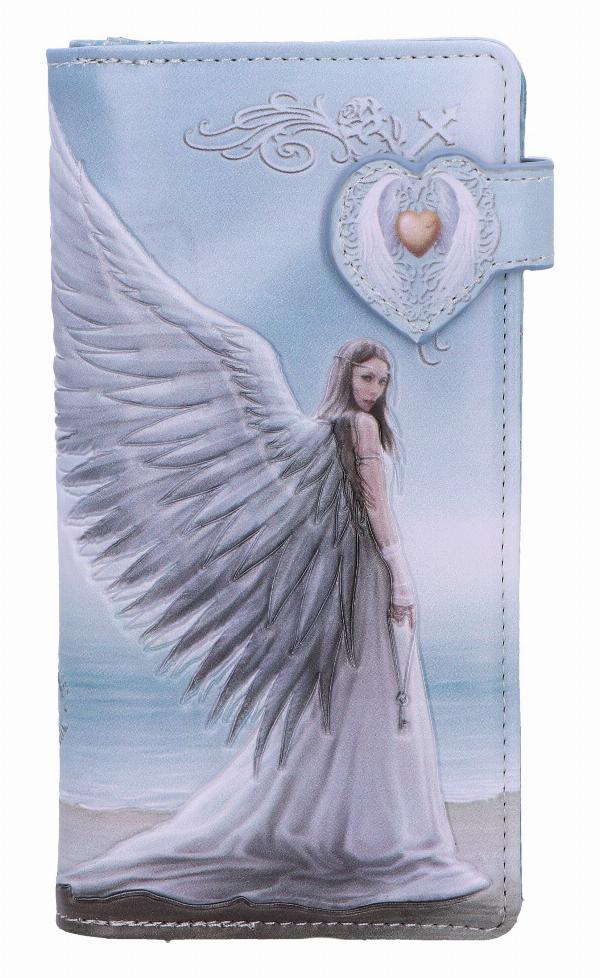 The Purse features an embossed design of a serene white-winged angel with flowing chestnut hair, standing on a peaceful shoreline. Elegant yet functional, it includes multiple card slots, compartments for coins and notes, and secures with a charming heart-shaped press stud closure. The embossing adds texture and depth, bringing Anne Stokes artwork to life.