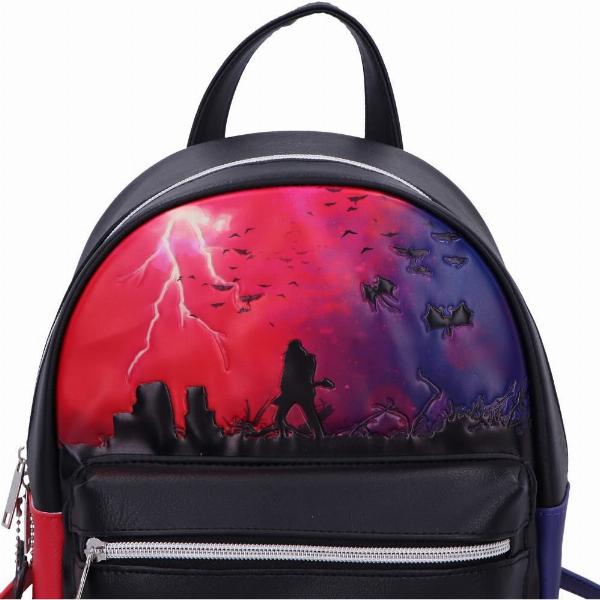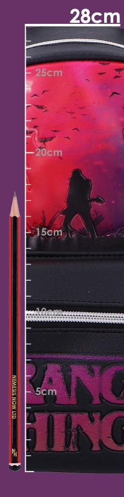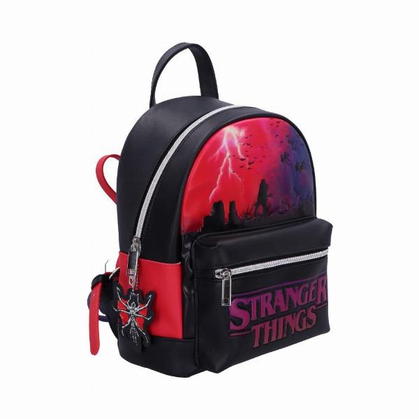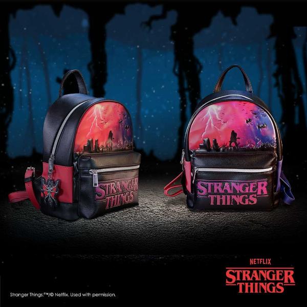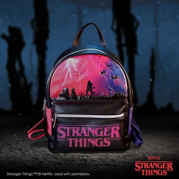 - Bold and stylish backpack inspired by the Upside Down from Stranger Things, blending dark tones with striking red and purple accents.