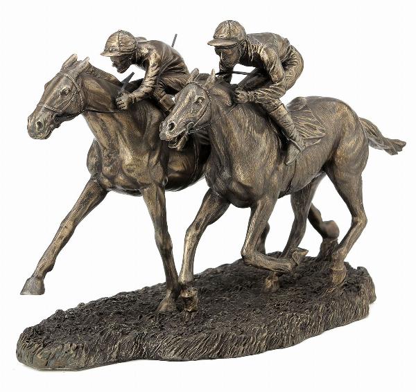 Bronze Horse Racing figurine featuring two jockeys locked in a battle. Will make an excellent gift for those fond of the horses and racing.