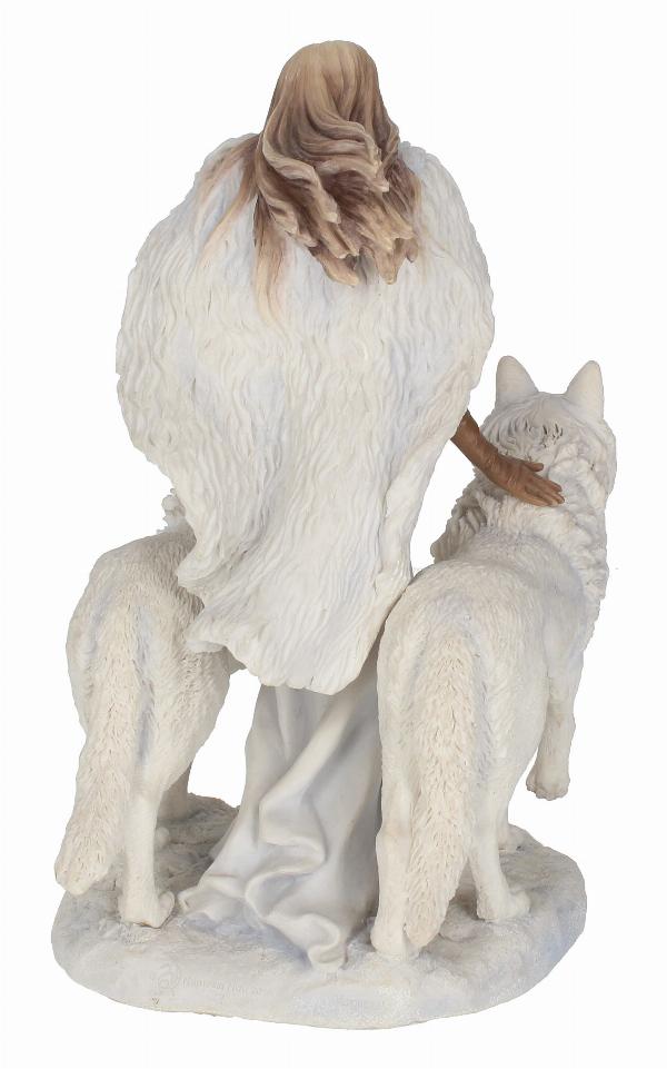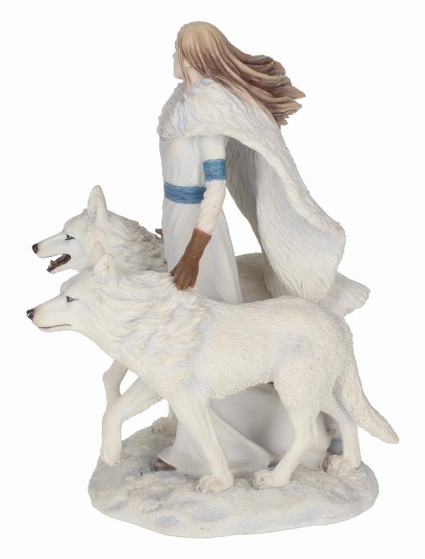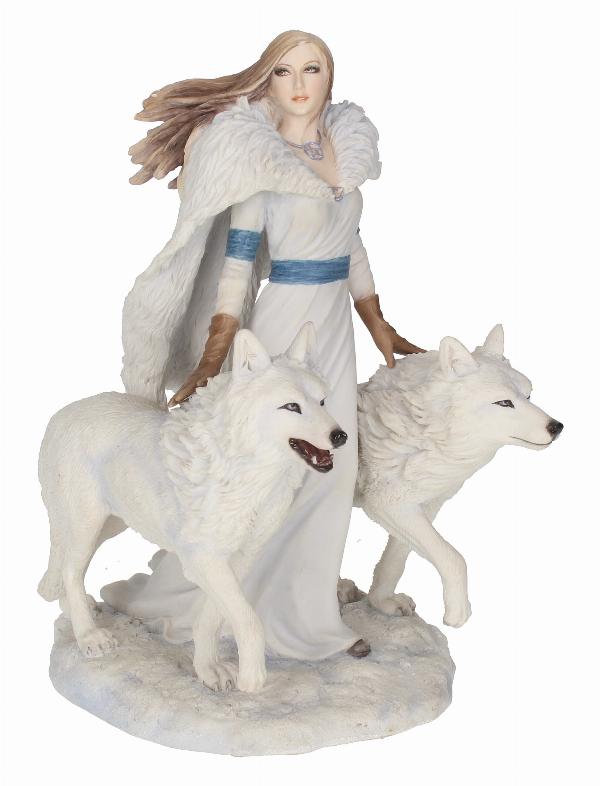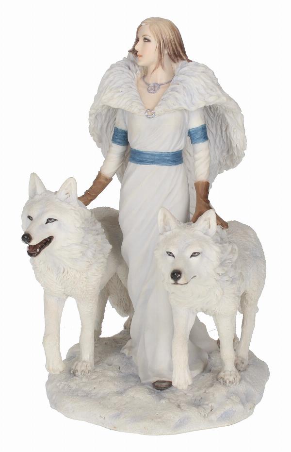 An impressive and detailed figurine designed by Anne Stokes featuring a lady in white with two white wolf protectors.
